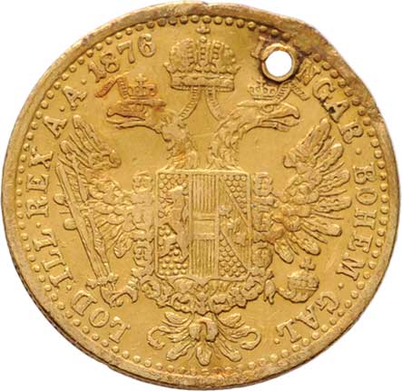 Dukát 1855 A (3.396g), 1861 A (3.428g), 1876 (3.468g), 1910 (3.468g), vše s dírkou, dr.hr., dr.rysky, patina 4ks