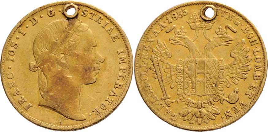 Dukát 1855 A (3.396g), 1861 A (3.428g), 1876 (3.468g), 1910 (3.468g), vše s dírkou, dr.hr., dr.rysky, patina 4ks