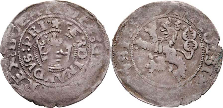 Pražský groš 1537, K.Hora-Jeptiška, Chv.C2/c.K, královská koruna, jedna tečka vlevo nad korunou, J.4, MKČ.70, 2.945g, nedor., vada mater. na hraně, patina