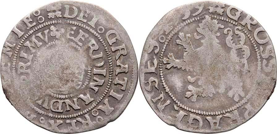 Pražský groš 1539, K.Hora-Jeptiška, jako Chv.T9/b.K, ale opis "FERDINANDVS:PRIMV", královská koruna, J.4, MKČ.71, 2.335g, exc., nedor., patina R!
