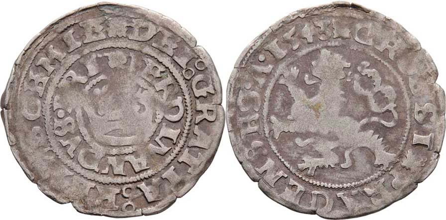Pražský groš 1543, K.Hora-Hubáček, Chv.6/b.K, královská koruna, J.4, MKČ.70, 2.593g, nepravidelný okraj, nedor., nep.dvojráz, pěkná patina R!