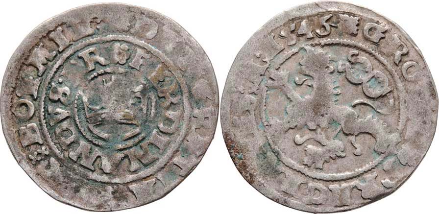 Pražský groš 1546, K.Hora-Lídl, jako Chv.5/b.K, ale dvojtečka za "BOEMI:", v reversu "A" mezi 4 křížky, J.4, MKČ.71, 2.926g, nedor., skvrny, patina R!