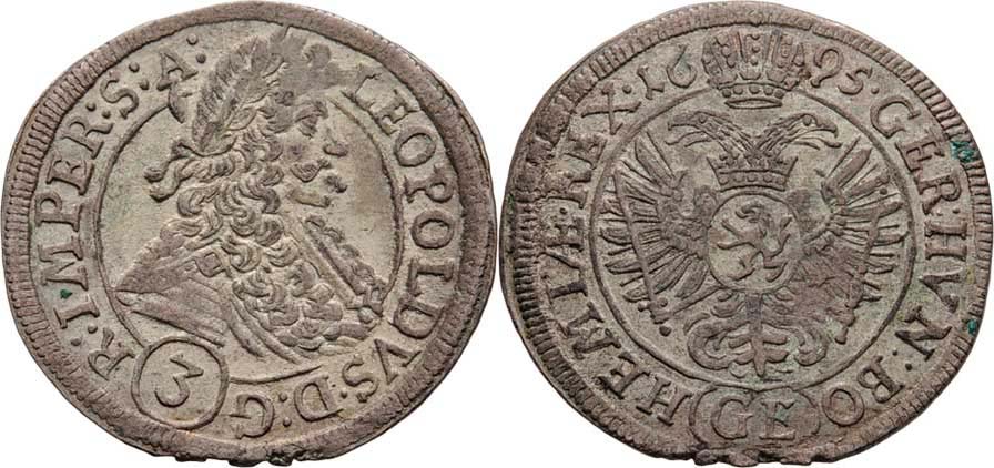 3 Krejcar 1695 GE, Praha-Egerer, MKČ.1425, Nech.202 - opisy "LEOPOLDVS.D:G(3)R:IMP.../GER:HVN:BO(GE)H...", 1.770g, krajový stř., nep.nedor., pěkná patina