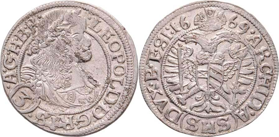 3 Krejcar 1669 SHS, Vratislav-Hammerschmidt, dělení opisů: "...I.S.(3).A.G.../...A.(SHS).DVX.B.ET.SI.", MKČ.1619, Mech.739, 1.692g, skvrnky R!