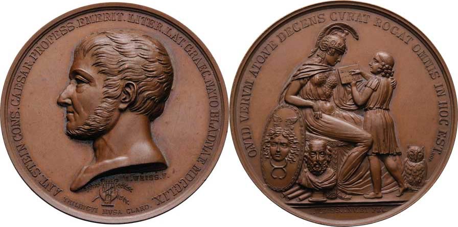 Anton Stein, profesor vídeňské university b.l. (1834) - poprsí zleva, lyra, opis / Aténa učí dítě, symboly moudrosti, opis, Sign., měď 52mm, 58.592g, patina R!