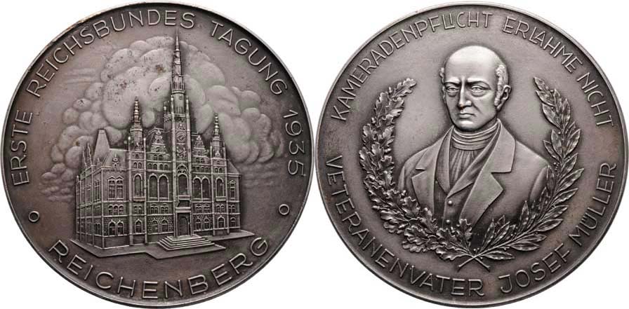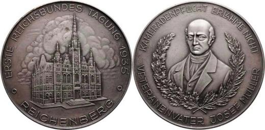 Reichenberg (Liberec) 1935 - veteránský říšský den - Josef Müller, zakladatel spolku, opis/ radnice, opis, Nesign., patin.postř.bronz 83mm, 148.213g, dr.hr. R!