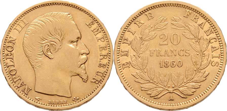 20 Frank 1860 A, Paříž, KM.781.1 (Au900), 6.420g, nep.hr., nep.rysky, pěkná patina