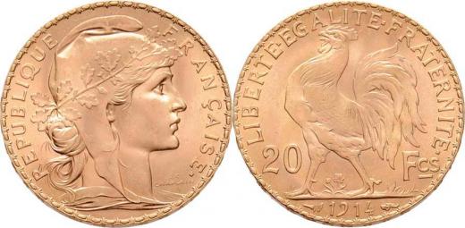 20 Frank 1914, Paříž, KM.857 (Au900), 6.452g, nep.hr., nep.rysky
