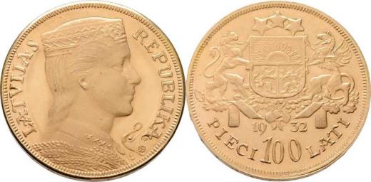 100 Lati 1932 - zlatá puncovaná novoražba podle mince 5 Lati 1932 (cca Au800, minimální náklad), 38.991g