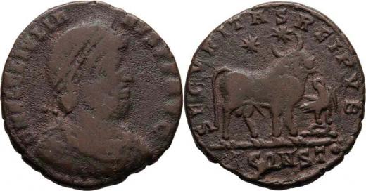AE1, Rv:"SECVRITAS.REIPVB.", býk zprava, orel držící věnec, S.3972, RIC.320 - Arelate - ražen 360 - 363, nedor., pěkná patina RR!
