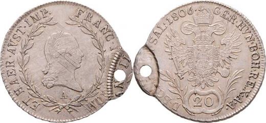 20 Krejcar 1806 A - v mincovně vyrobený přívěsek - místo pro dírku vytvořeno úderem razidla aversu, 6.597g, mírně just., pěkná patina R!