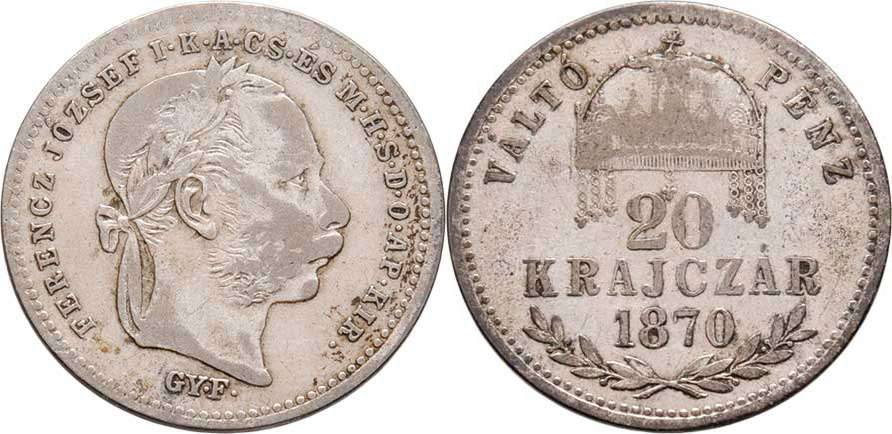 20 Krejcar 1870 GYF - krátký opis, 2.643g, nep.rysky, pěkná patina RR!