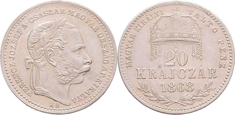 20 Krejcar 1868 KB - dlouhý opis, 2.562g, nep.hr., nep.rysky, pěkná patina, téměř