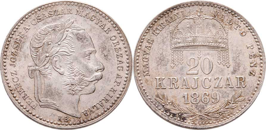 20 Krejcar 1869 KB - dlouhý opis, 2.649g, krásná patina R!
