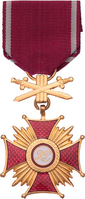 Záslužný kříž RP - patrně vydání po roce 1989, zlacený a smaltovaný bronz 42x42 mm s mečíkovým závěsem, závěsným kruhem a původní stuhou