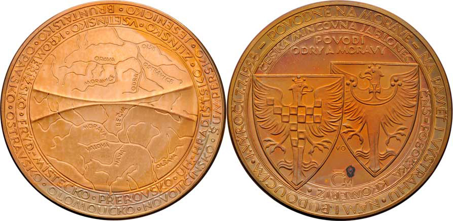 Oppl - 1.výročí povodní na Moravě 1998 - znaky Moravy a Slezska, nápis, opisy/ povodí Moravy a Odry, opisy, Sign., bronz 50mm, 61.951g, Fou.16b, etue
