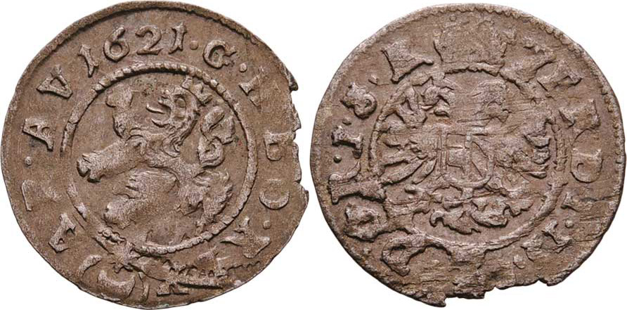 3 Krejcar 1621, Praha-Hübmer, J.1a, MKČ.707, 0.975g, dr.vylomený okraj, nedor., pěkná patina RR!