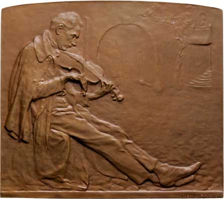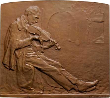 Houslista 1909, Sign., plaketa vydaná Vídeňskou spol. přátel drobné plastiky, číslo 48, patinovaný jednostranný bronz 75x70 mm