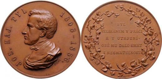 Josef Kajetán Tyl (1808 - 1856) b.l. - poprsí zleva, opis / 5-řádkový nápis v lipovém věnci, Sign., bronz 55mm, 84.560g, dr.hr., krásná patina