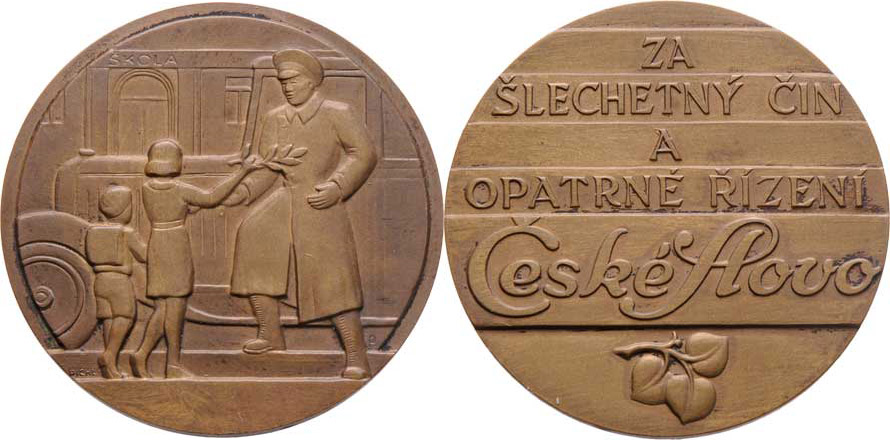 České slovo - Za šlechetný čin a opatrné řízení b.l. - dvě děti podávají vavřínovou snítku řidiči / nápis a lipový trojlístek, Sign., pat.bronz 45 mm, 37.500g