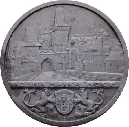 Praha - pohled z Karlova mostu na Malou stranu, nápis a znak nesený lvy, b.l., Sign., patinov. zinek 56 mm
