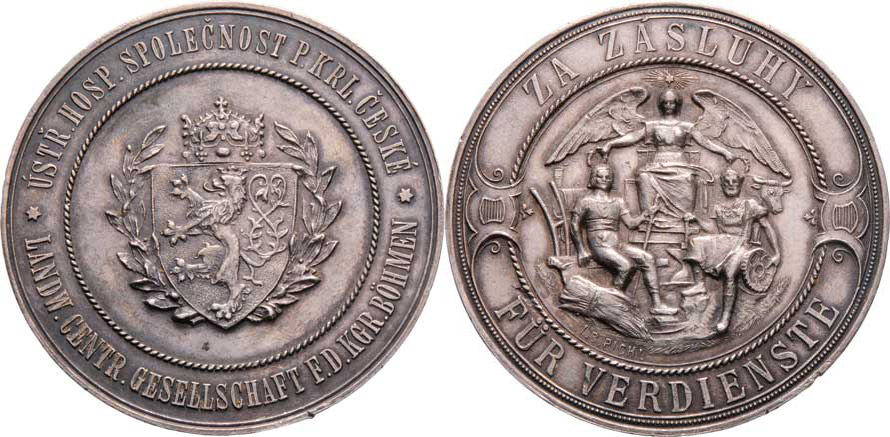 Ústřední hospodářská společnost pro Království české b.l. - korun.znak ve věnci, opis / alegorie a nápis, Sign., Ag900, 52mm, 43.993g, dr.hr., nep.rysky, pat.