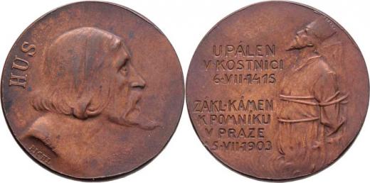 Jan Hus - základní kámen pomníku v Praze 5.7.1903 - hlava zprava, opis / Jan Hus na hranici, 7-řádkový nápis, Sign., měď 30 mm, nep.hr., patina, téměř