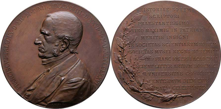 František Palacký - 100 let narození b.l. (1898) - poprsí zleva, latinský opis / vavřínová ratolest a 12-řádkový nápis, Sign., bronz 58mm, 76.609g, pat.