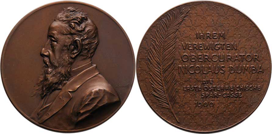 Nikolaus Dumba - vrchní správce spořitelny 1900 - poprsí zleva / palmová ratolest a 8-řádkový nápis, Sign., bronz 55 mm, 55.722g, pěkná patina, téměř