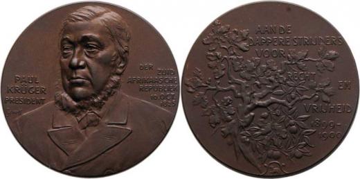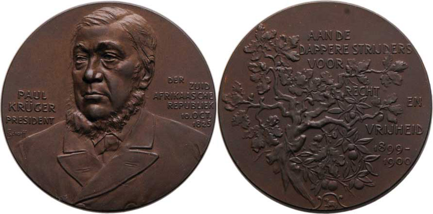 Paul Krüger - president Jihoafrické republiky 1900 - poprsí mírně zleva, nápis/ větev dubu a olivy, nápis, Sign., bronz 39 mm, Bach.313a, krásná patina