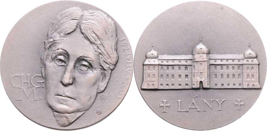 Charlota Garigue Masaryková 13.V.1923/2003 - portrét čelně, monogram, vročení / zámek Lány, kříže, nápis, Sign., postř. bronz 40mm, 28.349g, 20ks, etue RR!