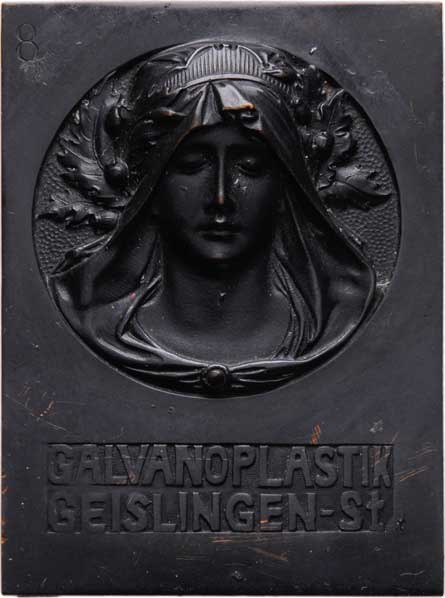 Reklamní plaketa Galvanoplastik Geislingen St. b.l., Nesign., patin. dutá měď 48x67 mm, číslov. "8", rysky
