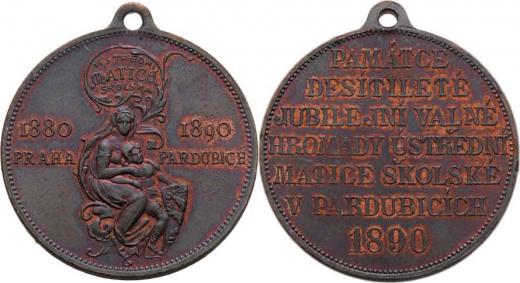 Jubilejní valná hromada matice školské 1890 - sedící matka s dítětem, nápisy / 7-řádkový nápis, Nesign., měď 30 mm s původním raženým ouškem, patina, téměř