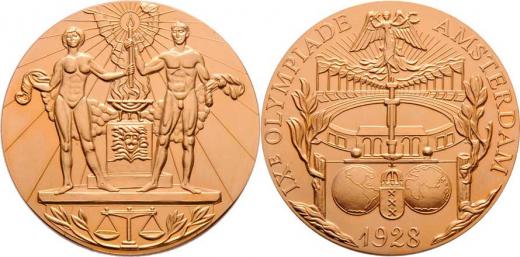 Amsterdam 1928 (pozdější) - IX.letní olympijské hry - alegorie / Niké nad stadionem, mapy, písmo, Nesign., zlacený bronz 50 mm