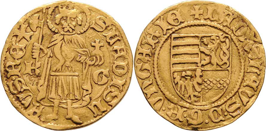 Dukát (1453) K-G, Kremnica-Konrad Hölczler, svatý Ladislav, opis / 4-dílný znak, opis, Fr.16, Len.29/4, Pohl.H2-5, 3.365g, mírně okr., zvl., dr.hr., patina