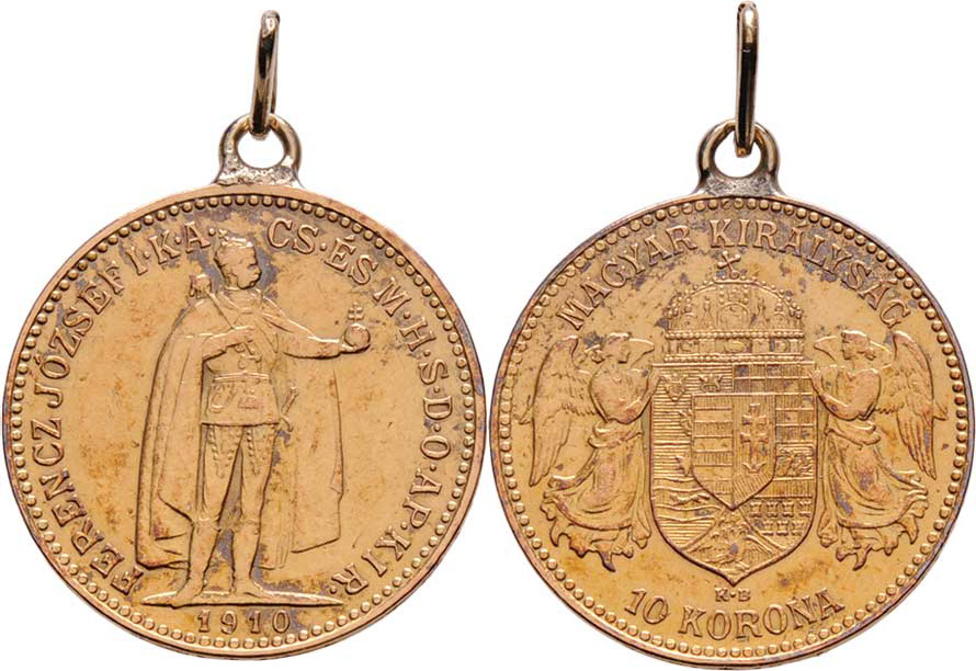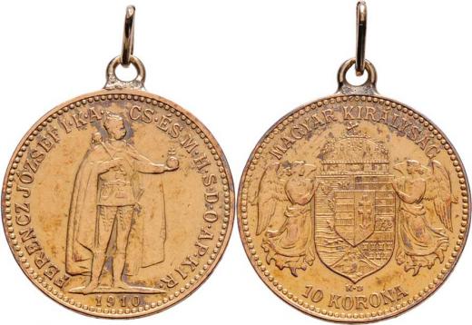 10 Koruna 1910 KB s ouškem a závěsem, celková hmotnost 3.486g, dr.hr., dr.rysky, patina