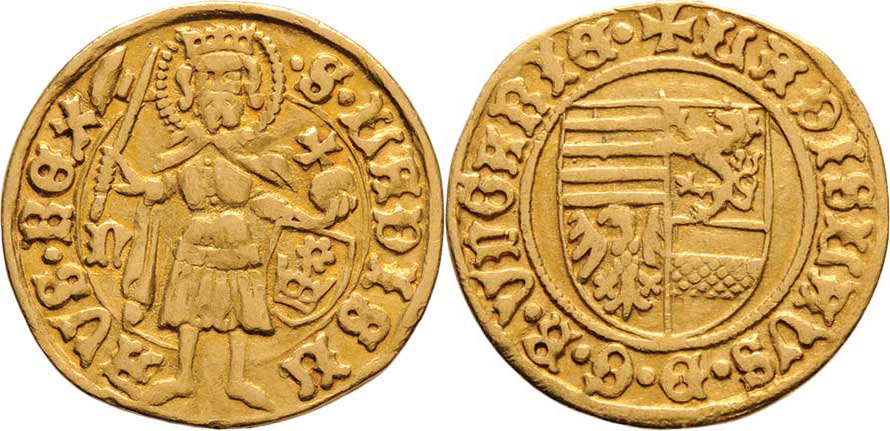 Dukát (1455-1456) "n-korunka ve štítu", Nagybanya, svatý Ladislav, opis/ čtyřdílný znak, opis, Len.29/9, Pohl.H2-9, Husz.636, Fr.16a, 3.375g, nep.okr., patina