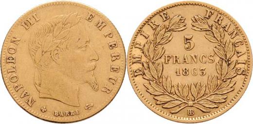 5 Frank 1863 BB, Strasbourg, KM.803.2 (Au900), 1.608g, nep.hr., vlas.rysky, pěkná patina