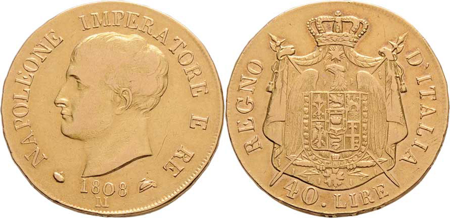 40 Lira 1808 M, Milano, Cr.12 (Au900), 12.828g, dr.hr., nep.rysky, vl.škr., pěkná patina