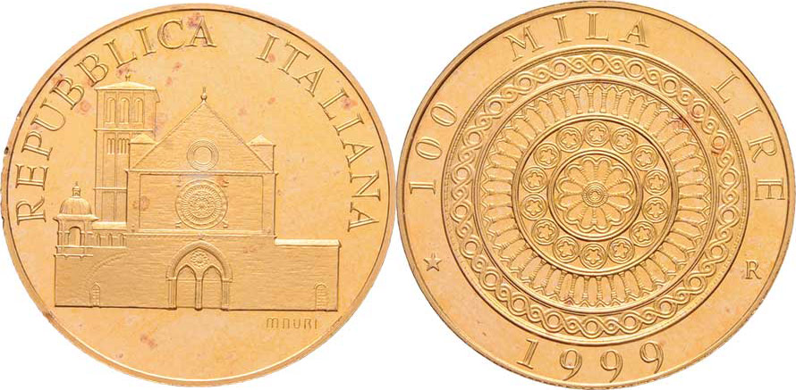 100.000 Lira 1999 R - basilika sv.Františka v Assisi, KM.229 (Au900, 15.00g, pouze 5.047 ks), kapsle, patina RR!