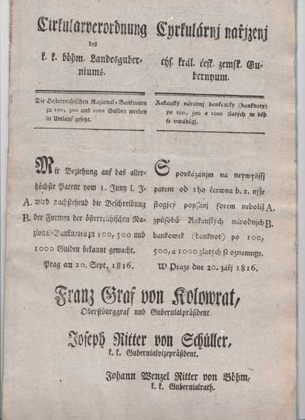 František II., 20.IX.1816 - vydání bankocedulí 1816 v nominálu 100,500 a 1000 Zlatých, 10 stran textu a 3 formuláře, podepsán hrabě Fr.Kolowrat, krásně