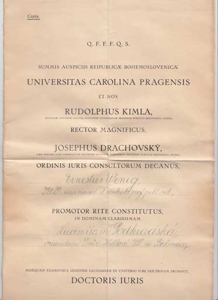 Praha 1933 - Ludmila Podhradská - diplom Právnické fakulty Karlovy university, podpis JUDr.Wenig, dobře