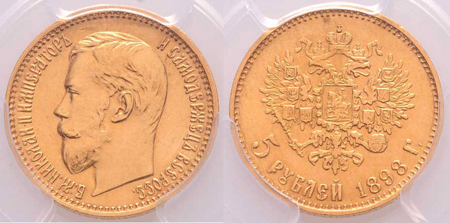 5 Rubl 1898 AG, Petrohrad, Y.62 (Au900, 4.28g), nep.hr., nep.rysky, pěkná patina, zataveno v etui PCGS (uvedena zachovalost Au58), téměř