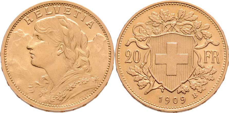 20 Frank 1909 B, Bern, KM.35.1 (Au900), 6.450g, nep.hr., nep.rysky, pěkná patina