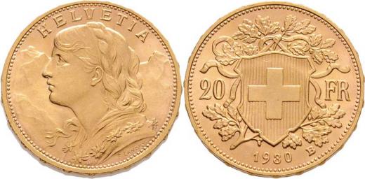20 Frank 1930 B, Bern, KM.35.1 (Au900), 6.444g, nep.hr., nep.rysky, téměř