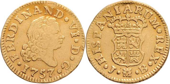 1/2 Escudo 1757 M-JB, Madrid, KM.378 (Au917), 1.687g, nep.hr., nep.rysky, mírně zvlněný, nepatrná stopa po oušku, patina R!