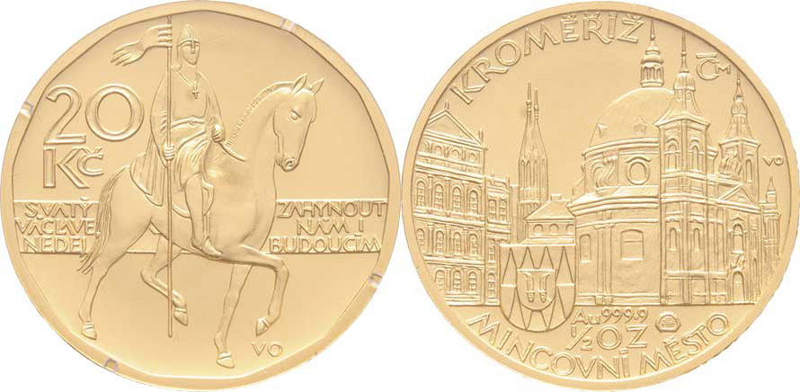 Oppl - mincovní město Kroměříž b.l. (1998) - pohled na město, znak, písmo / replika reversu oběhové dvacetikoruny, Au 999, 26mm, 15.589g, kapsle, etue