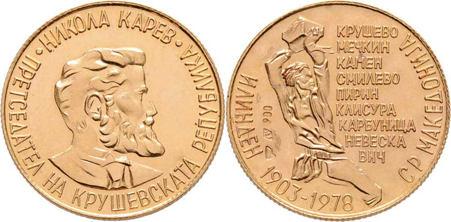 Nikola Karev - předseda Kručevské republiky 1903/1978 - poprsí zprava, opis / památník povstání, písmo, Nesign., Punc., Au900, 4.999g, 20mm R!