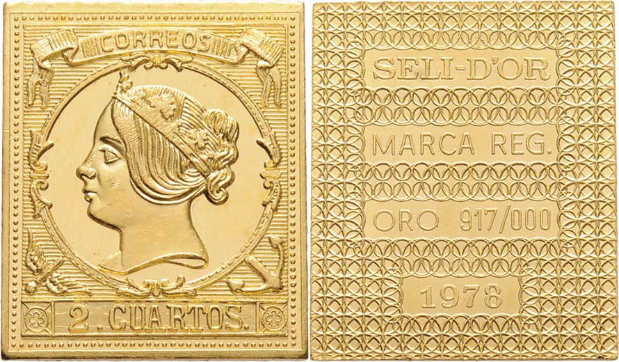 Zlatá replika nejstarší španěl. poštovní známky 1978 - královna Isabela II., 2-řádk.nápis / 4-řádk.nápis, Au917, 20x24 mm, 6.542g R!