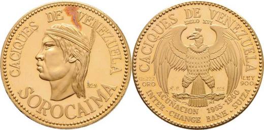Sorocaima, indiánský náčelník, b.l. - hlava zleva, opis / kondor držící svazek šípů, opisy, Sign.RCV, Au900, 30mm, 22.320g, kapsle, skvrna R!